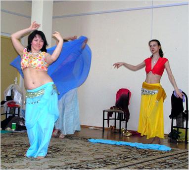 Это мы и сделали, сняв с себя пояса с монетками и прочие атрибуты восточного танца и попробовав себя в других направлениях. В итоге у нас получились: история соперничества на испанские мотивы, играющие в карты цыганки, почти детективный рассказ о незнакомце в шляпе в «свободном» стиле. А от романа о любви в русском народном танце ведущая семинара была просто в восторге.